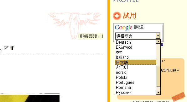 將游標移到網誌上的翻譯工具,下拉捲軸選擇語言,呆凌很順手的選了日語。