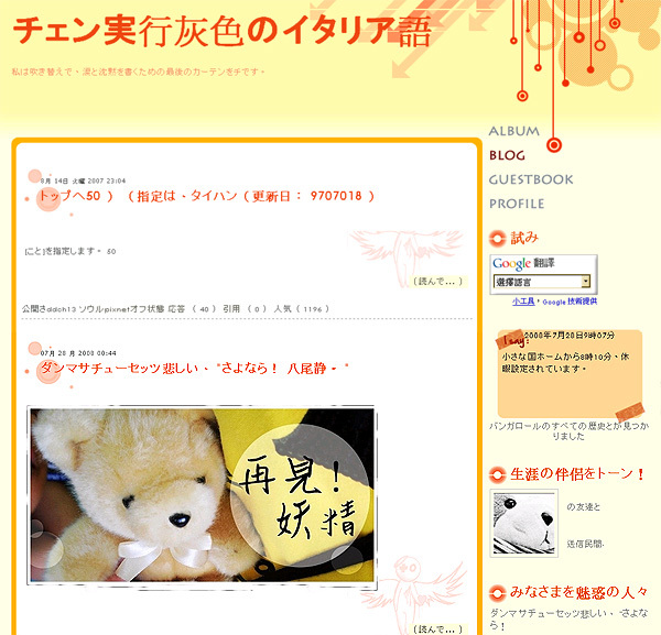 當下我怔了怔,雖然我知道我日文差,我也知道,瀞然灰意這個網誌名稱不好翻釋…但…「チェン実行灰色のイタリア語」?