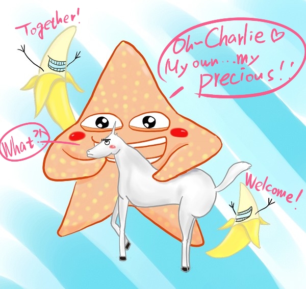 我腦袋很不爭氣的,一直想到Cherlie裡的海星一直喊愛我愛我,呃,可是我不會畫動物,獨角獸就更不用提了……可是接下來就要一直趕插畫的工作了,怎麼辦怎麼辦?!為此我今天看了一快半小時的Cherlie……就一直重覆看那隻讓我的印象深刻的海星倒底長啥樣!