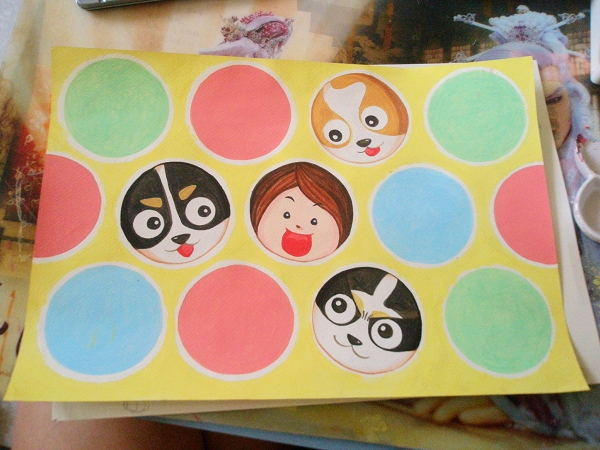 下面是第一張,對照前頭的失敗作,這張就變得很可愛了呢!為了畫三隻狗,連續好幾天都盯著三狗組看,畫著畫著,「嗯?阿麥你的日本眉到底是什麼顏色?」這麼想著的同時,狗就被我抱到大腿上東看西研究了。阿麥跟阿炘都還好,小可整個就是不願意被畫的樣子,看到壓克力就躲進牠的狗窩了……(一定是小可平常虧心事做太多,才怕被我用壓克力幫牠畫眉毛的逃走)