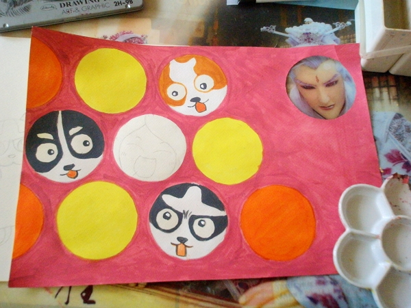 第三張,三狗組集合!因為是在學校趕著畫的,嗯?學校是趕畫背景啦,但一失足成千骨恨,壓克力沾在手上,抹到其他地方了,嗚嗚嗚…有汙點,但沒有時間重畫了,這張花的時間已經不是個位數的了……嗯,夜晚在教室拍的相片,原稿比較鮮豔XD