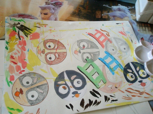 因為繪技太差,前頭就說了,失敗了很多張,但見不得人的太多,所以也放了一張上來笑一下,某一格圈圈被我挖空,純粹是另有用途,但空著奇怪,我的桌墊兼餐墊兼諸多功能的珍珠肥龍,看他很想出場的樣子,就正好給他一格大頭照了。