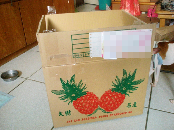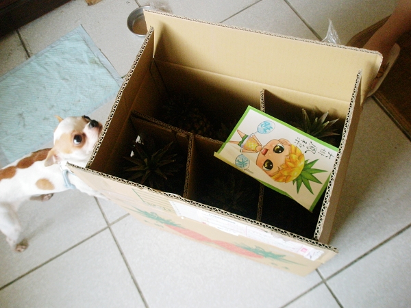 剛寄來的時候是這樣一大箱(有兩只鳳梨被放在一旁準備開刀了),我記得好像是五大一小吧~因為是直接從產地配送,所以日期方面好像電話溝通了一陣子,簡單的說,現在正值產季,台味館希望水果是新鮮直達的,所以採取方式是跟客戶確認好配送日,早上收割後直接貨寄府上,哦呵呵~好有趣~