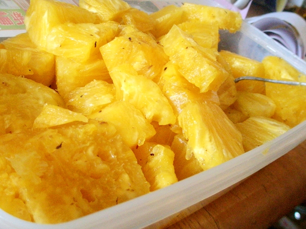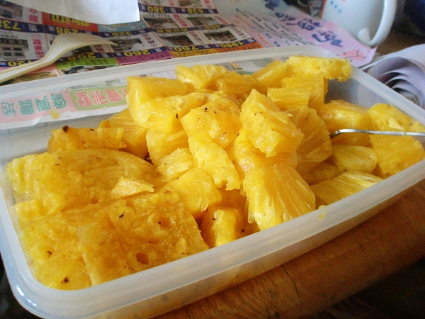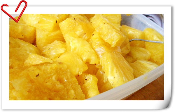 口味嘛~~其實我對鳳梨的印象跟以前吃的經驗,就是偏酸的,雖然我喜歡吃黑醋,但其實我不愛吃鳳梨的酸的,只是這家鳳梨是偏甜的,酸度是微酸,我吃反而剛剛好,而且不知道是鳳梨好還是小花切鳳梨技術好,難得我吃了很多隔天嘴巴居然沒破皮,大滿足~~害我不知節制的又連吃了好幾天……本來想說太大顆的可能就不好吃了,結果也還是甜甜中帶微酸,而且多汁,小花無聊到把從鳳梨滲流出來的水集合在一起拿去做冰塊了……這……老實說我還沒動到冰塊,我不知道該從何使用啊……