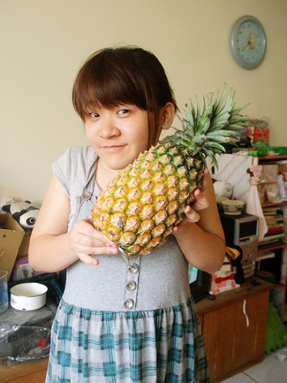 前頭說了,這次收到的鳳梨有五大一小,現在是唯一一顆小顆的鳳梨,小歸小,可是也跟小花的頭差不多大,黃澄澄的好漂亮,不過馬上送給也愛上網買東西的阿嬤家了XD