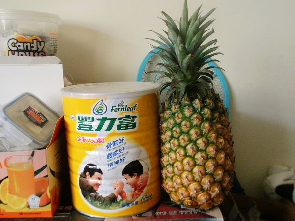 拿小花的頭來對比鳳梨也不準,又拿了一顆鳳梨來跟豐●富的奶粉罐比,啊,是大的那種奶粉罐,葉子那部分不算的話,鳳梨跟奶粉罐一樣高呢,不過其實應該還要高一點,因為鳳梨沒有支撐,所以放的是有點斜躺的XD