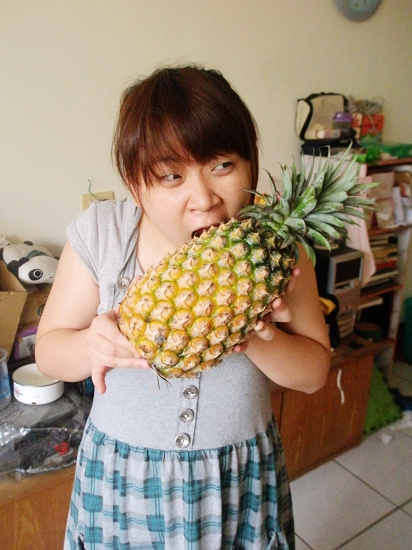 下一刻小花就開始搞笑了,可怕啊,鳳梨比小花的大頭還大啊!QAQ!